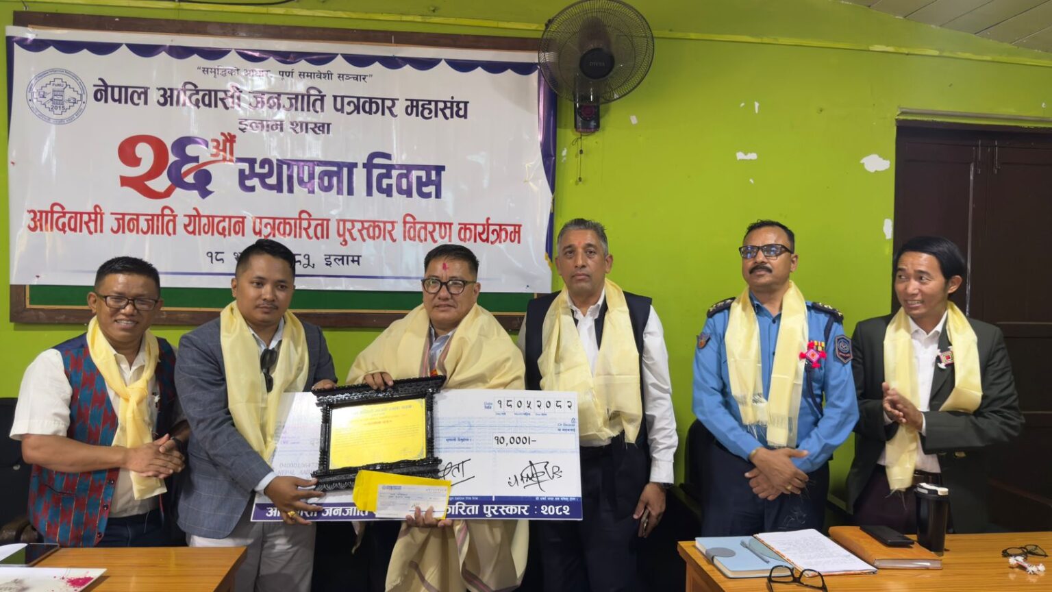 इलामः नेपाल आदिवासी जनजाति पत्रकार महासंघ इलाम शाखाले आफ्नो २६ औं स्थापना दिवसको अवसरमा “समृद्धिको आधार, पूर्ण समावेशी सञ्चार” भन्ने मूल नारासहित आयोजना गरेको कार्यक्रममा आदिवासी जनजाति योगदान पत्रकारिता पुरस्कार वितरण गरिएको छ ।