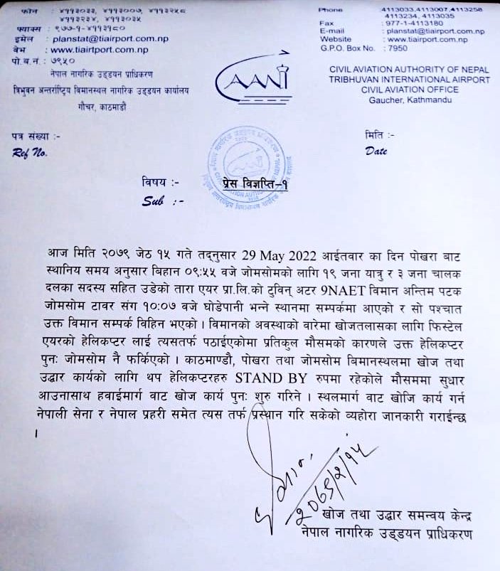मौसम सफा भएपछि फेरि हेलिकप्टर सम्पर्कविहीन जहाज खोजीमा जाने उल्लेख गरेको छ। हिँडेर नेपाली सेना र नेपाल प्रहरी जोमसोमको टावरसँग नजिक घोडेपानी भन्ने स्थानतर्फ खटिएको बताएको छ।